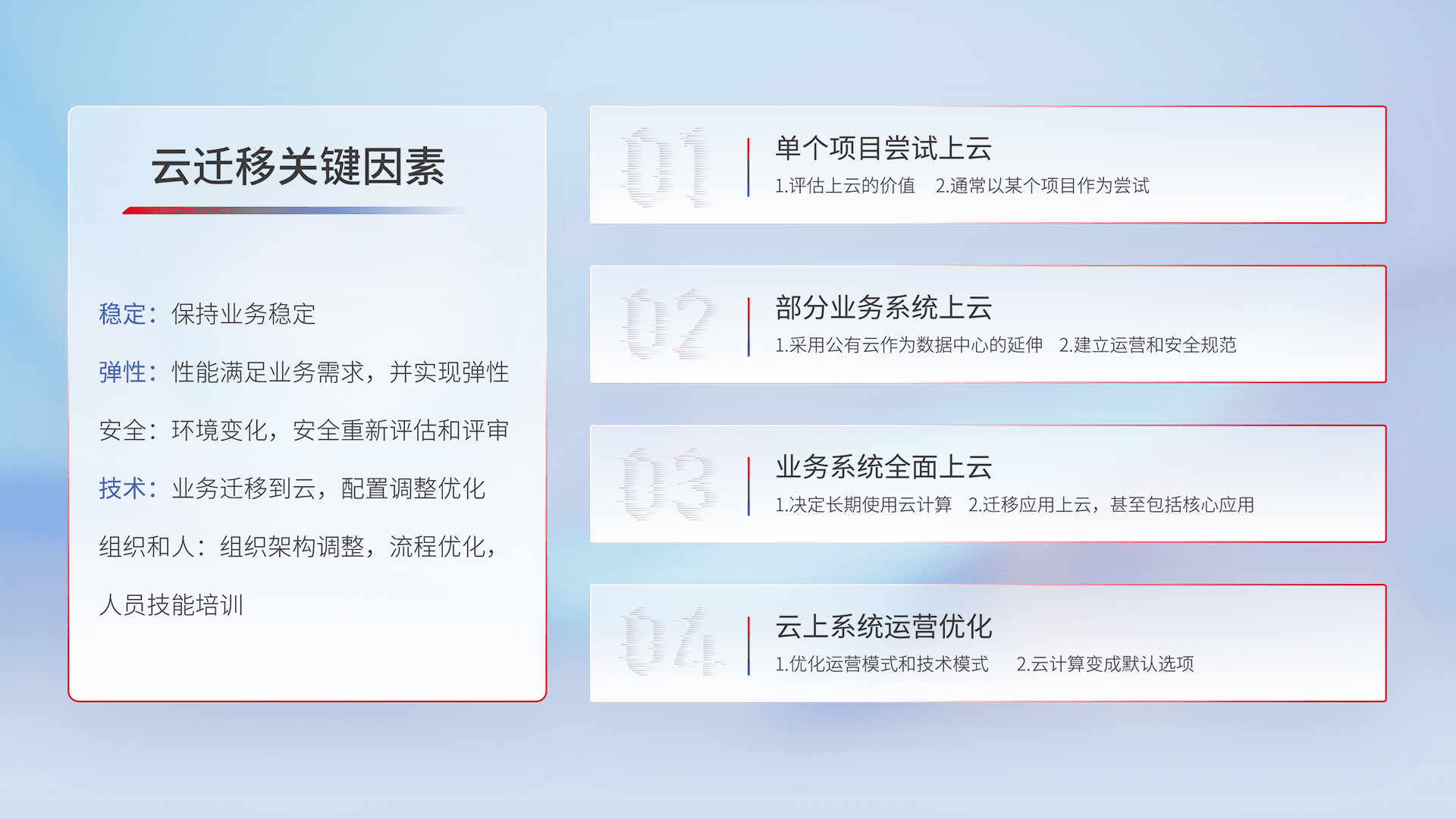 结合实际业务,,,,从规划设计、、云平台选型、、、云原生改造、、、数据迁移、、、、集成交付,,迁移全过程为客户识别最佳上云路径,,,做好风险识别管理,,,设计网络架构、、、、身份权限、、、安全审计合规、、操作审计、、、日志审计、、、、监控告警策略、、多站点容灾设计等,,,对云上基础设施进行整体规划,,提升IT治理水平,,以满足弹性、、、、高可用、、高性能的需求。。