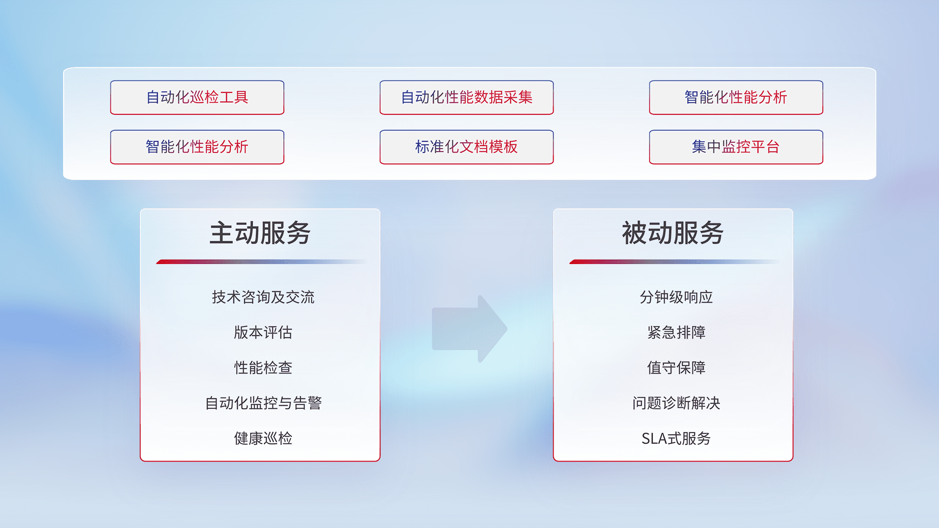 智能化工具和标准化文档,,,保障服务质量,,提供主动服务(包含技术咨询、、、、版本评估、、性能检查、、自动化监控与告警、、、、健康巡检)和被动服务包含(分钟级响应、、、紧急排障、、值守保障、、、、问题诊断解决、、、SLA服务)。。。